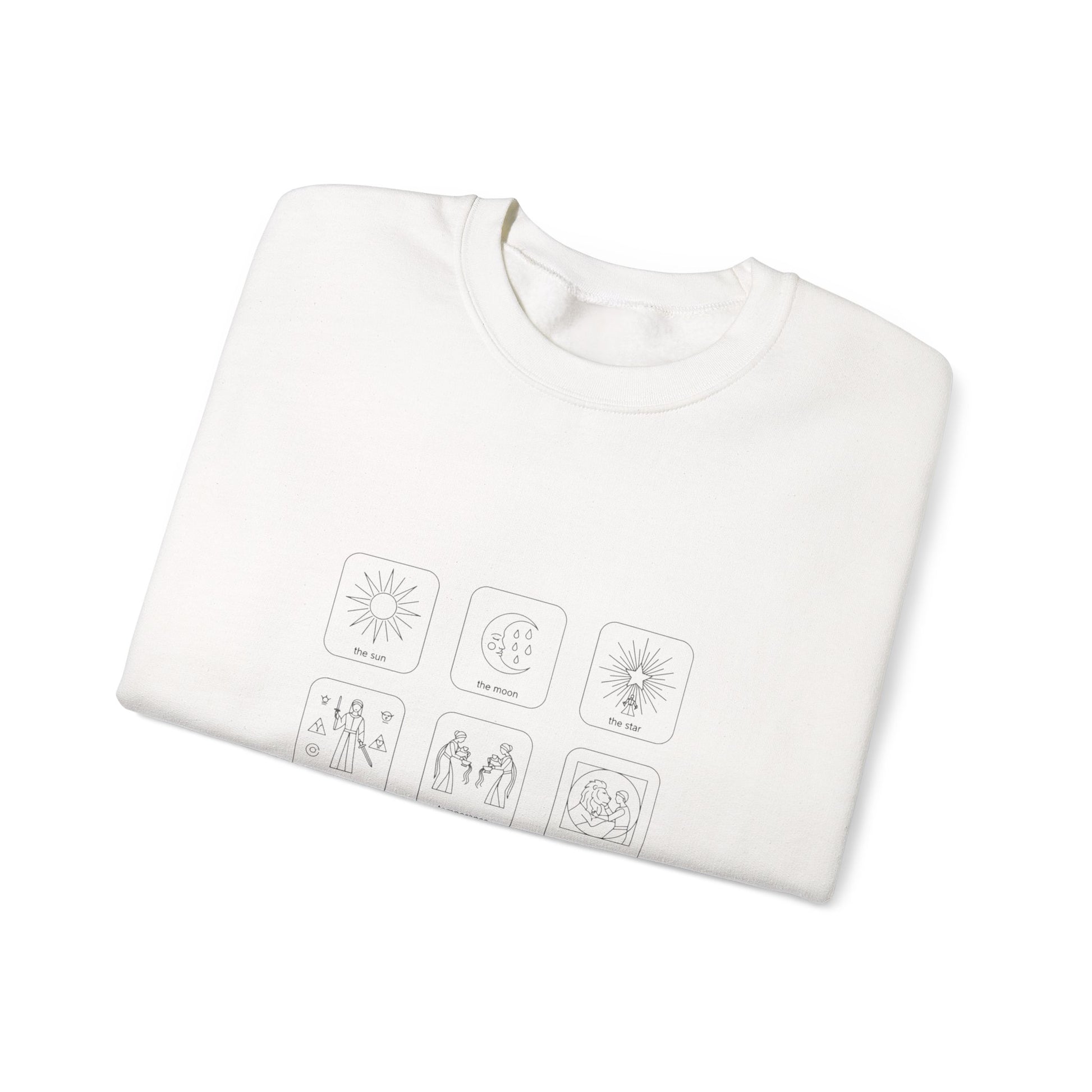 Monochrome icon grid sweatshirt designed for a pared-back wardrobe. A tidy 3x3 arrangement of single-color symbols sits at center chest, using generous negative space and a neutral system-like style that reads modern and calm. Matches minimalist, design-focused wardrobes and layers cleanly under coats or over collared shirts.
